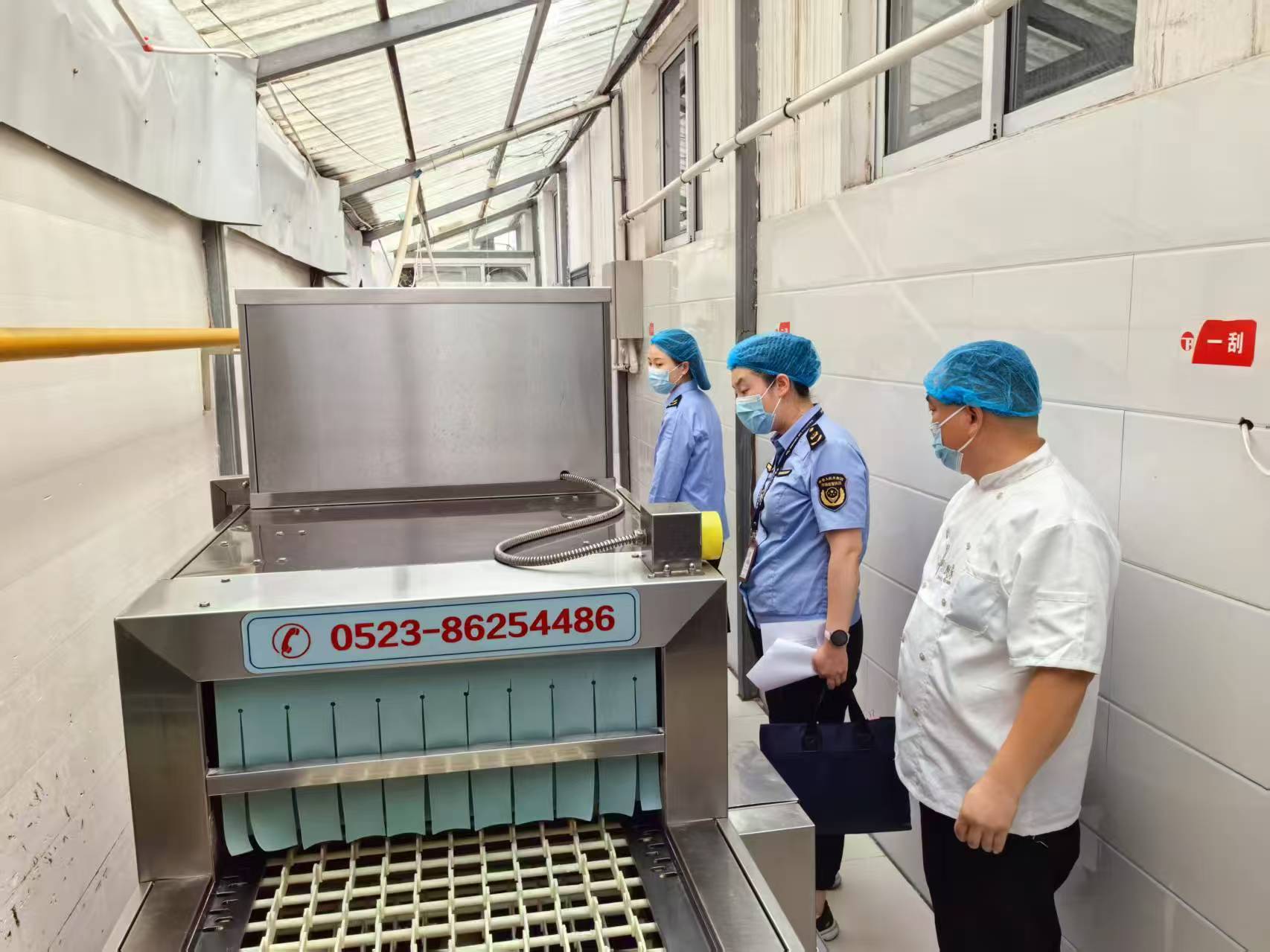 餐具平安: 法律人员细心查看了餐具清洗消毒设备运转形态!